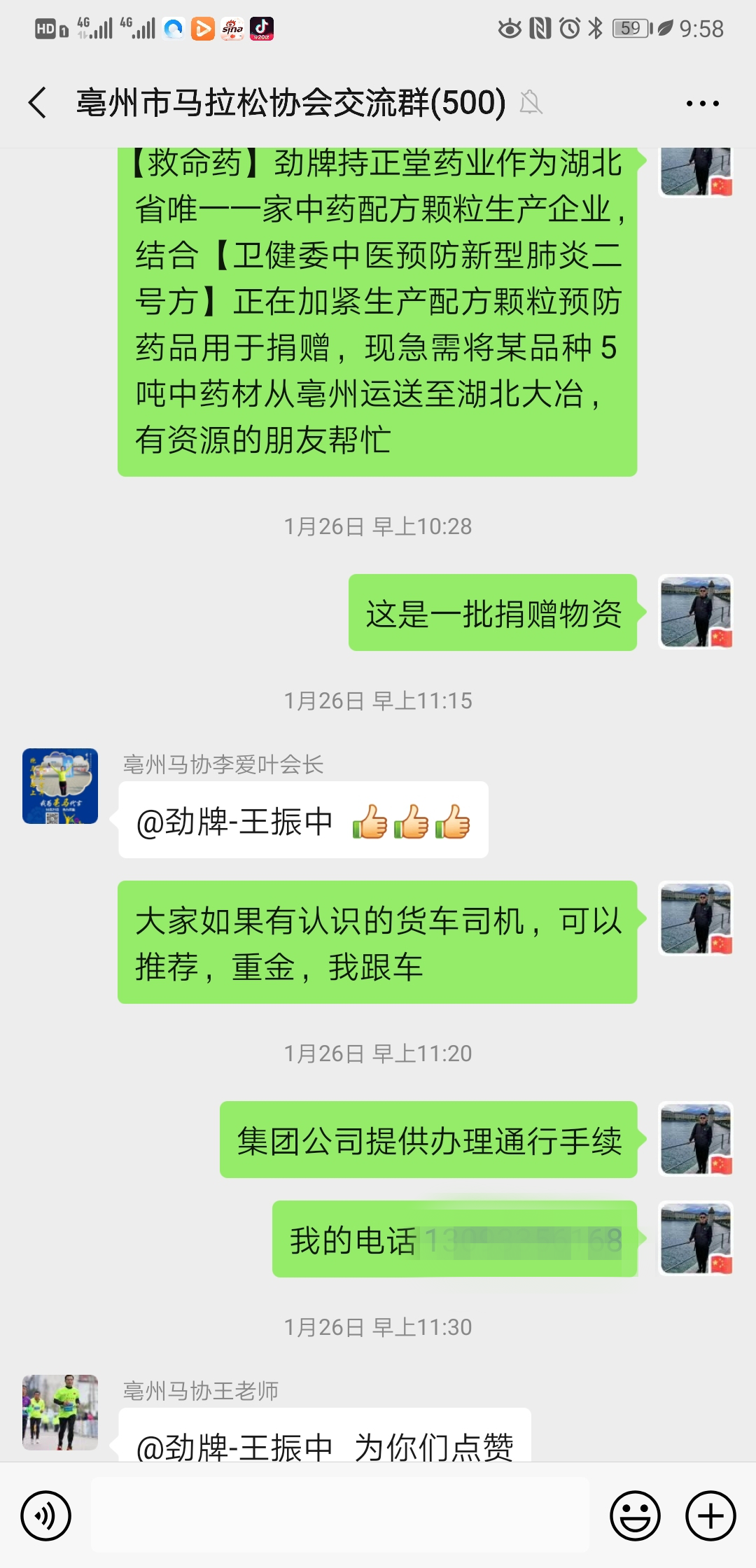 我還聽說,為了這次藥材采購,勁牌人非常拼!在找車、找司機上協(xié)調(diào)了很多資源。勁牌公司常務(wù)副總裁王楠波親自協(xié)調(diào)安徽阜陽、亳州的經(jīng)銷商和營銷人員,協(xié)助尋找物流資源。安徽亳州保健酒經(jīng)銷商趙總、白酒經(jīng)銷商南總,阜陽總經(jīng)銷商蔣總、市場營銷經(jīng)理丁雷、王振中行動迅速,建立了專門的微信群,發(fā)動親朋好友和員工,尋找合適的車輛和司機。大家翻遍了朋友圈內(nèi)貨運行業(yè)從業(yè)朋友的信息,電話打了一個又一個,各種微信交流群里分享找車信息。