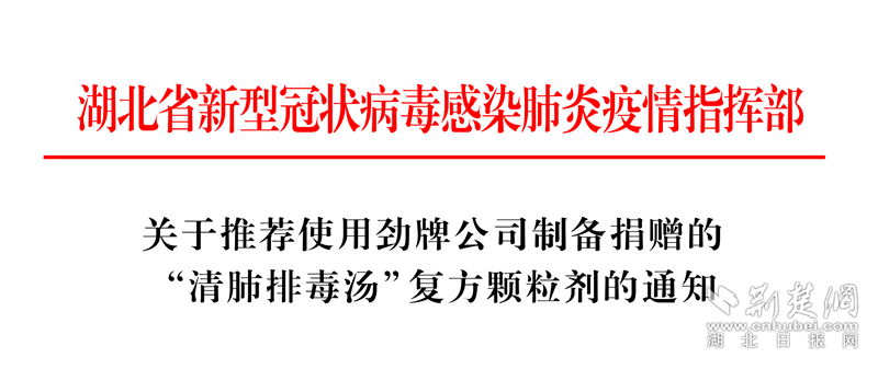 2月22日,湖北省新型冠狀病毒感染肺炎疫情指揮部下發(fā)《關(guān)于推薦使用勁牌公司制備捐贈的“清肺排毒湯”復(fù)方顆粒劑的通知》。通知說明,為切實加強湖北省新型冠狀病毒感染肺炎防治工作,充分發(fā)揮中醫(yī)藥在新冠肺炎治療中的作用,決定在全省定點醫(yī)療機構(gòu)、方艙醫(yī)院、集中隔離治療點推薦使用勁牌持正堂藥業(yè)制備并捐贈的“清肺排毒湯”復(fù)方顆粒劑。